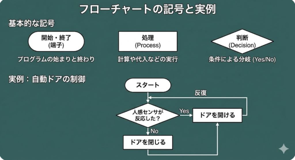 【塾からのアドバイス】 フローチャートの問題は、パズルのようなものです。 「記号の形(長方形は処理、ひし形は判断)」を覚えるのはもちろんですが、「身の回りの家電(炊飯器やエアコン)が、どんな条件で動いているか」を想像してみることが一番の練習になります。