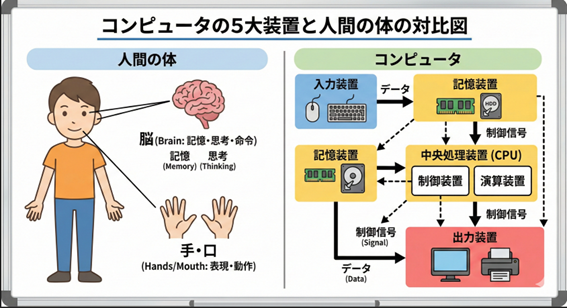 人間が何か作業をする時と同じように、コンピュータも5つの役割分担で動いています。「装置名」と「具体的な機器」の組み合わせが必ず問われます。
